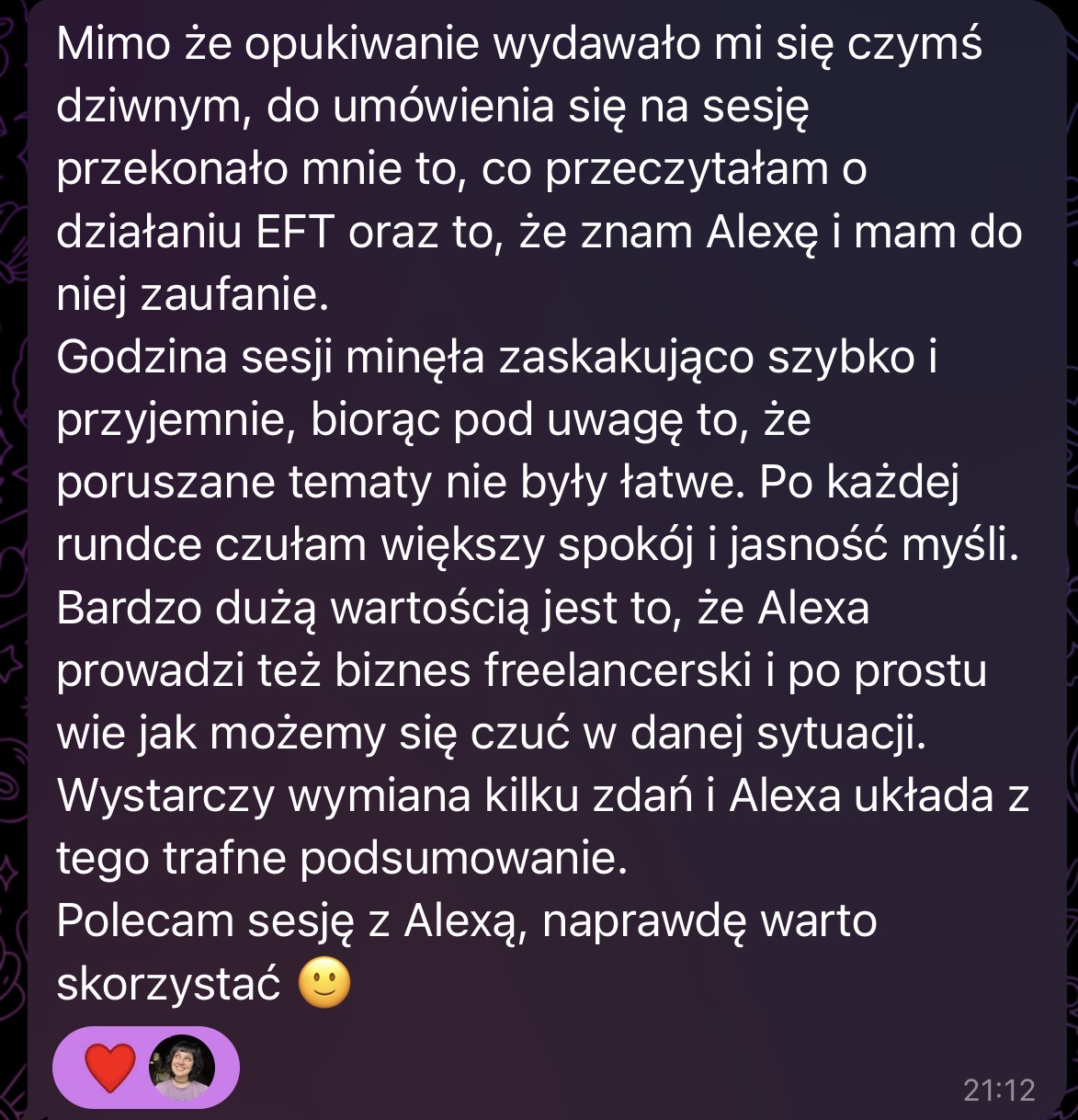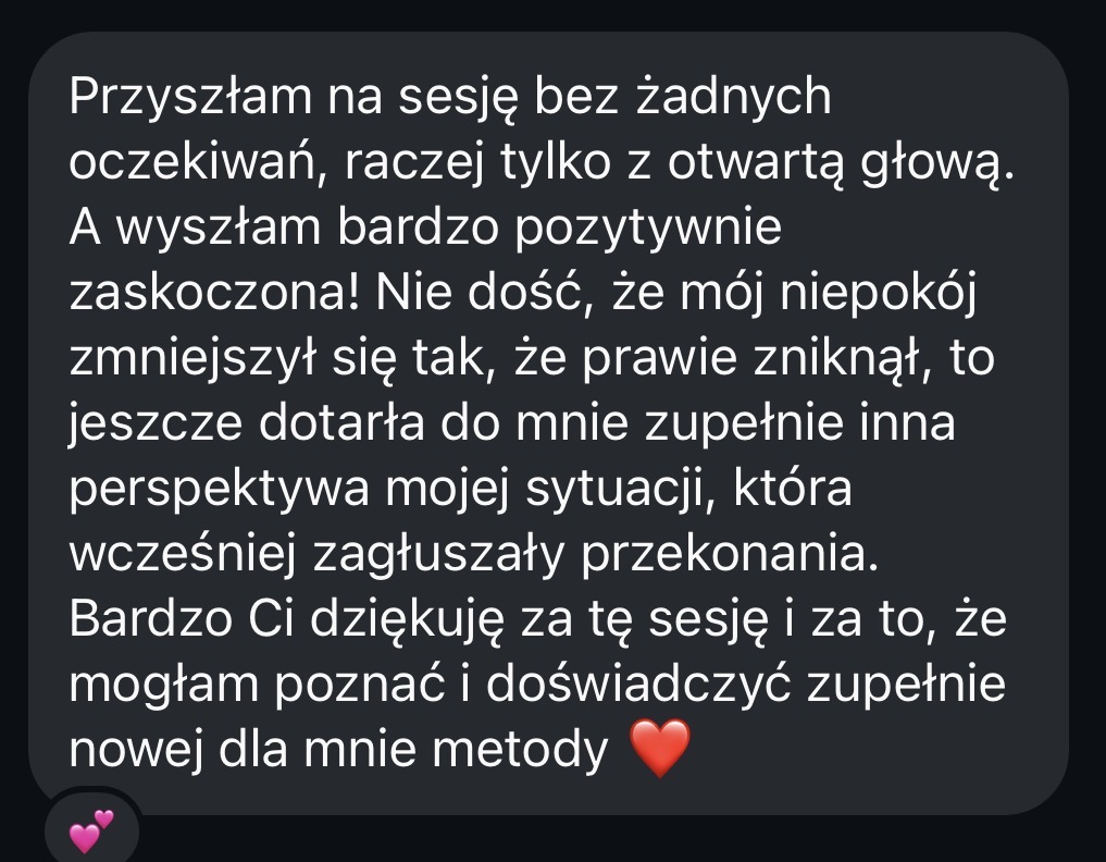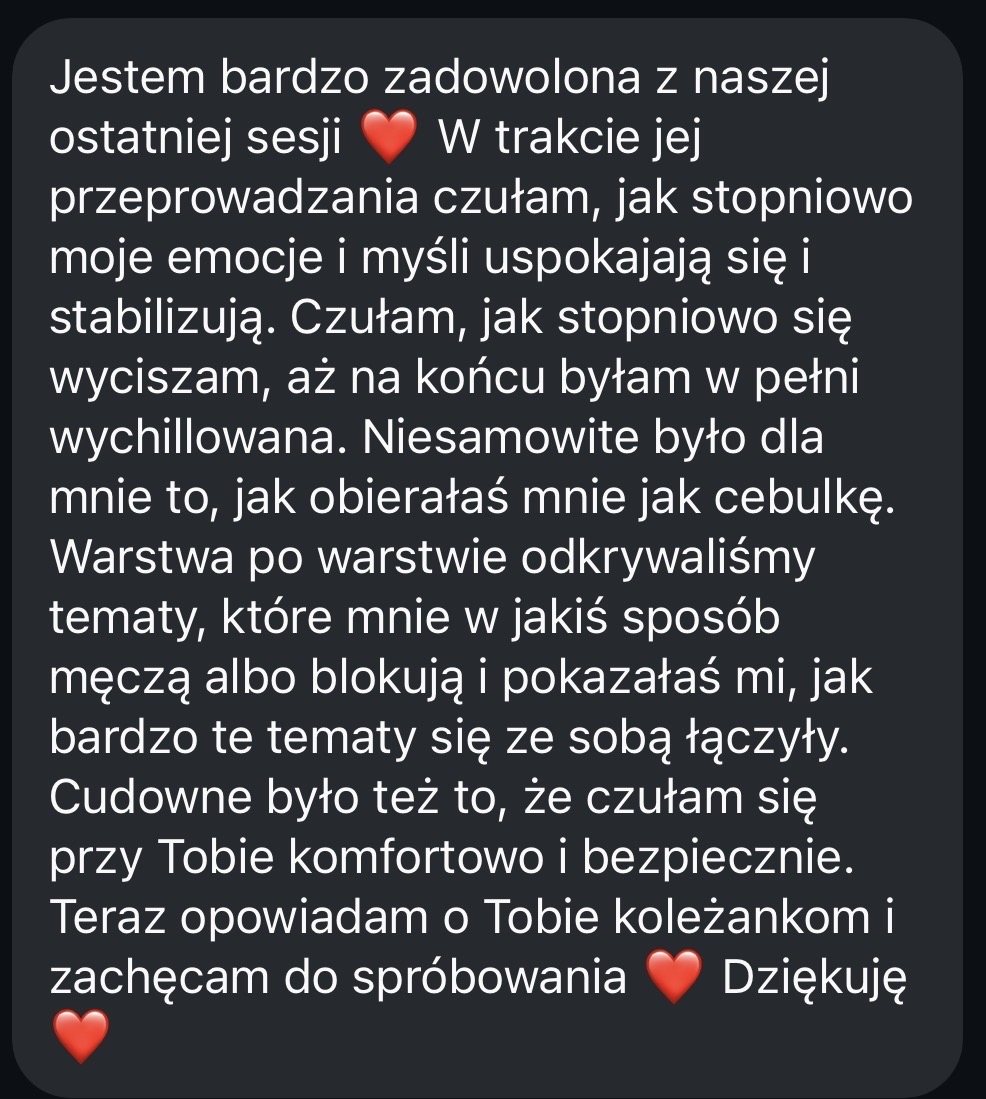 • Będziesz miała moje stałe wsparcie między sesjami w prywatnej konwersacji na Telegramie, abyś mogła na bieżąco rozwiązywać trudne sytuacje zamiast czekać na spotkanie. Odpowiadam na wiadomości w dni robocze w godzinach 10-18.