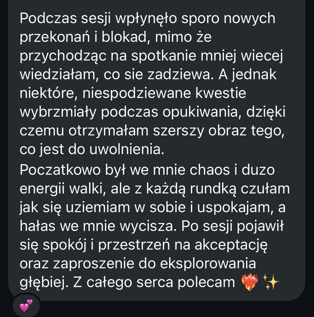 • Będę rozpisywać rundki EFT, których aktualnie potrzebujesz – wystarczy, że napiszesz do mnie na Telegramie, a maksymalnie w przeciągu 24 godzin od Twojej prośby, otrzymasz gotową sekwencję do samodzielnego opukania. W ten sposób będziesz mogła ćwiczyć samoregulację i uczyć się stosowania EFT każdego dnia.