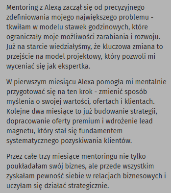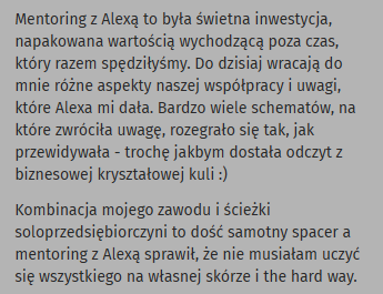 Pracowałam już z około 50 kobietami działającymi jako freelancerki i marki osobiste. Sama przeszłam drogę od biznesu prowadzonego w ciągłym napięciu do spokoju, pewności i satysfakcji.